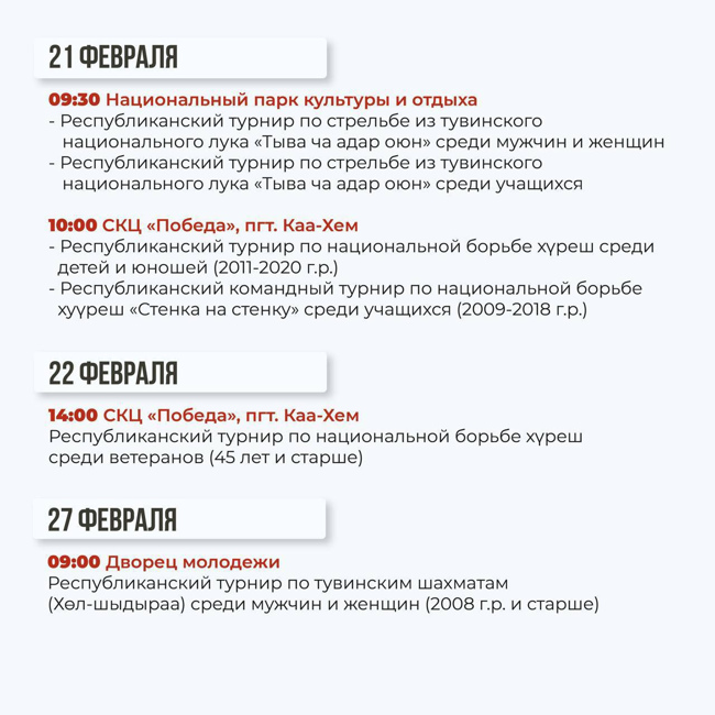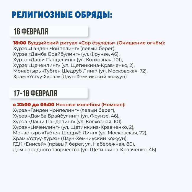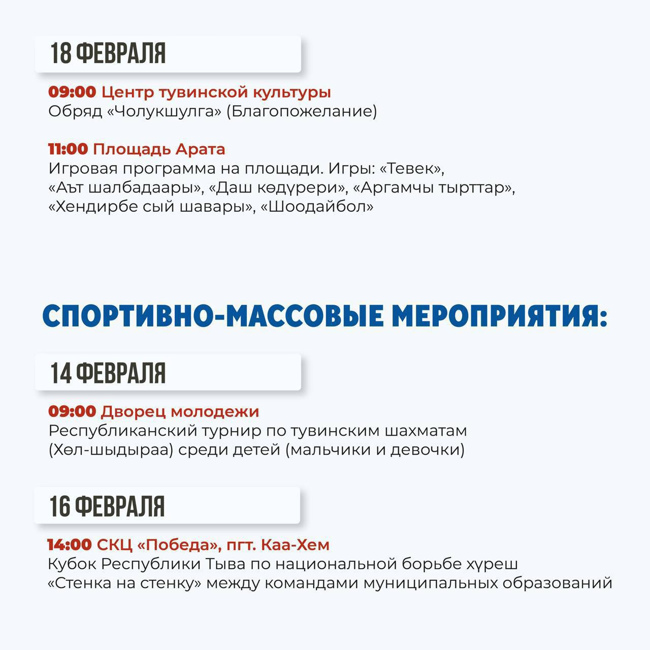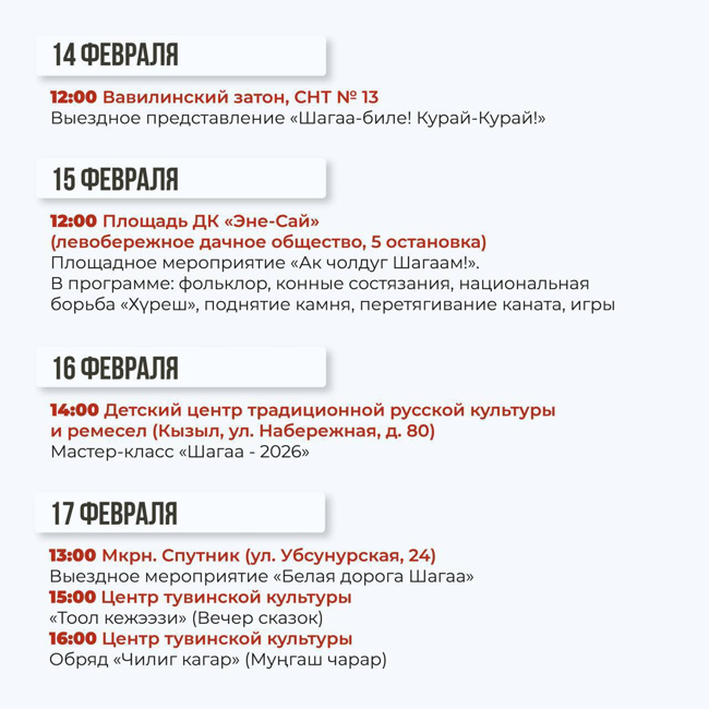 Шагаа - Новый Год по лунному календарю. Традиционно мероприятия проходят на муниципальном и республиканском уровнях. В утвержденный план вошли наиболее массовые события республиканского значения.